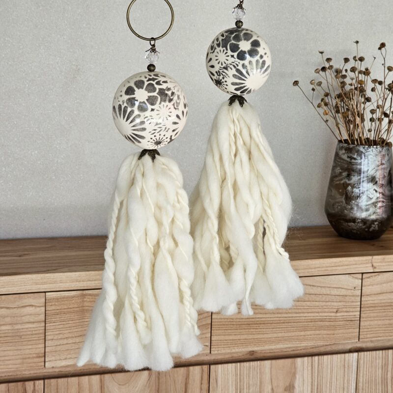 Colgante con Medallon de ceramica pintado a mano Flores Grises.