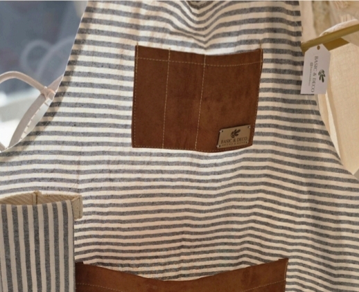Delantal confeccionado en tusor con detalles en cuero gamusado