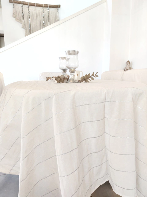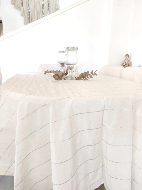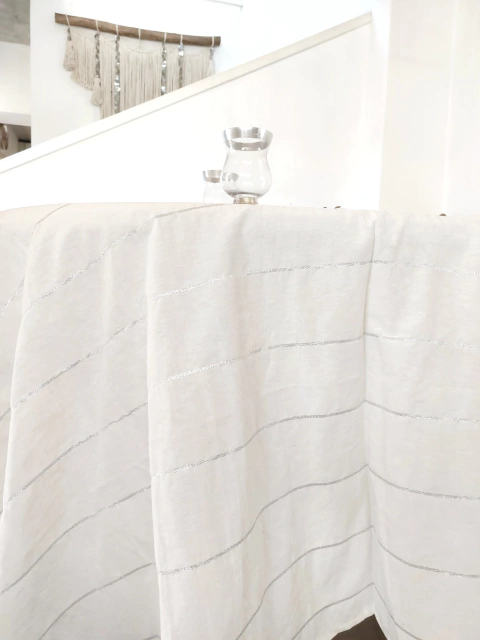 Mantel de tusor de algodon con rayas plateadas, mide 1.5×2.5m aproximadamente.