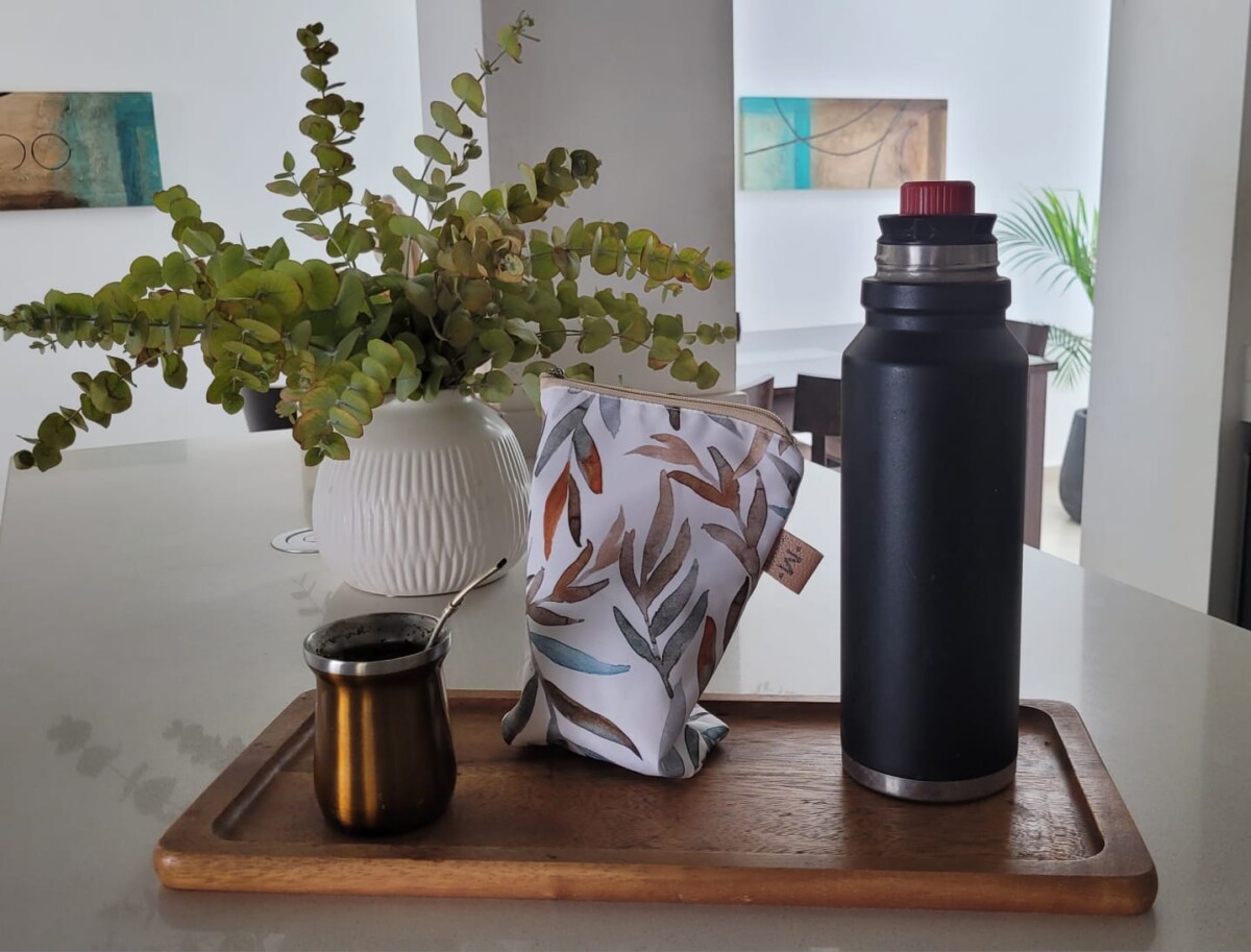 Sobre multiusos de tela impermeable, cierre de metal reforzado. Podes usarlo también para guardar el mate.