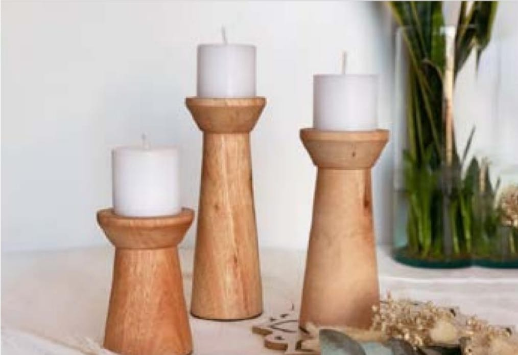 Elaborados con madera saligna, conocida por su resistencia y belleza natural, cada candelabro se entrega curado, lo que realza su aspecto y asegura una larga vida útil. Este proceso protege la madera, manteniendo su brillo y belleza a lo largo del tiempo.
